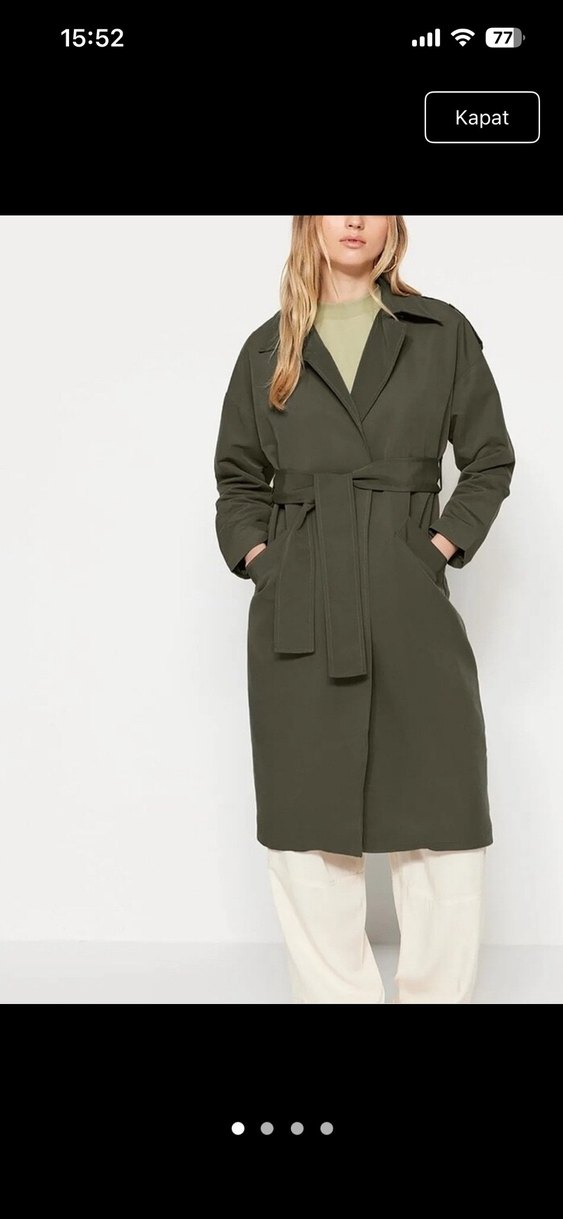 Kadınlar için kemerli uzun trençkot, kesilmiş yaka ve uzun kollu tasarıma sahiptir. Regular fit kesim, minimalist ve sokak stili görünümü, koyu haki gri renkte ve sentetik kumaştan üretilmiştir. Günlük kullanım için uygundur.