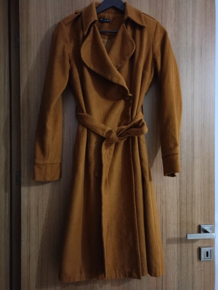 Kadınlar için kemerli, uzun kollu, notched yaka ve yumuşak süet kumaştan yapılmış, vintage tarzda bej renkli dar kesim kaban.