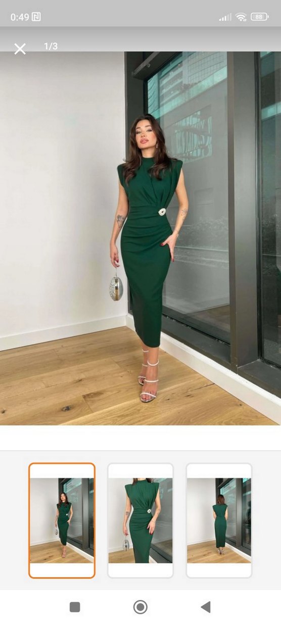 Kemer detaylı, V yakalı, kolsuz uzun yeşil kalem elbise. Parlak sentetik kumaştan üretilmiş, ofis kullanımı için uygun rahat kesim.