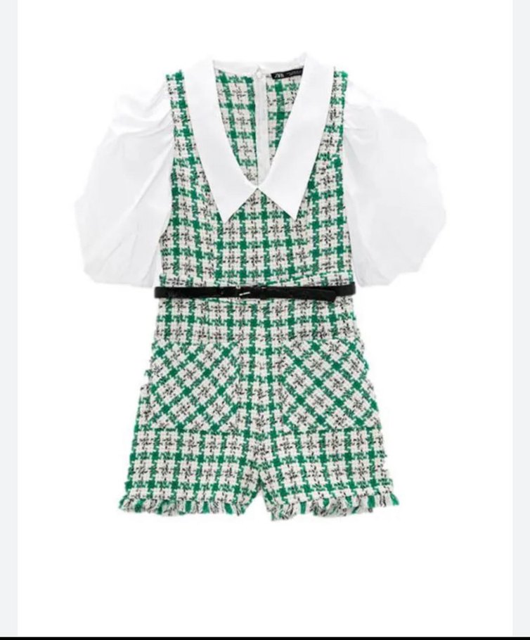 Kadın Kemerli Yeşil Kareli Mini Tulum Zara orginal