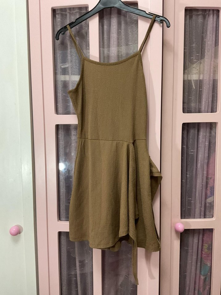 Keten kumaştan, askılı ve salaş kesim mini tulum. Drapeli tasarımı ve askısız yaka detayıyla günlük sokak stili için uygundur.