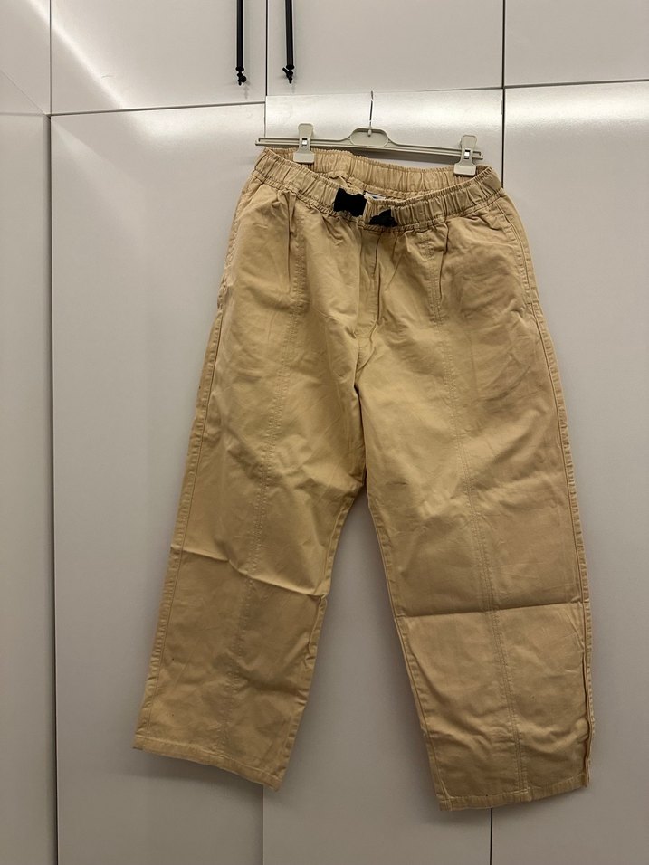 Keten kumaştan yapılmış, kemerli ve bol kesim bej pantolon. Rahat ve şık sokak stili için uygundur.