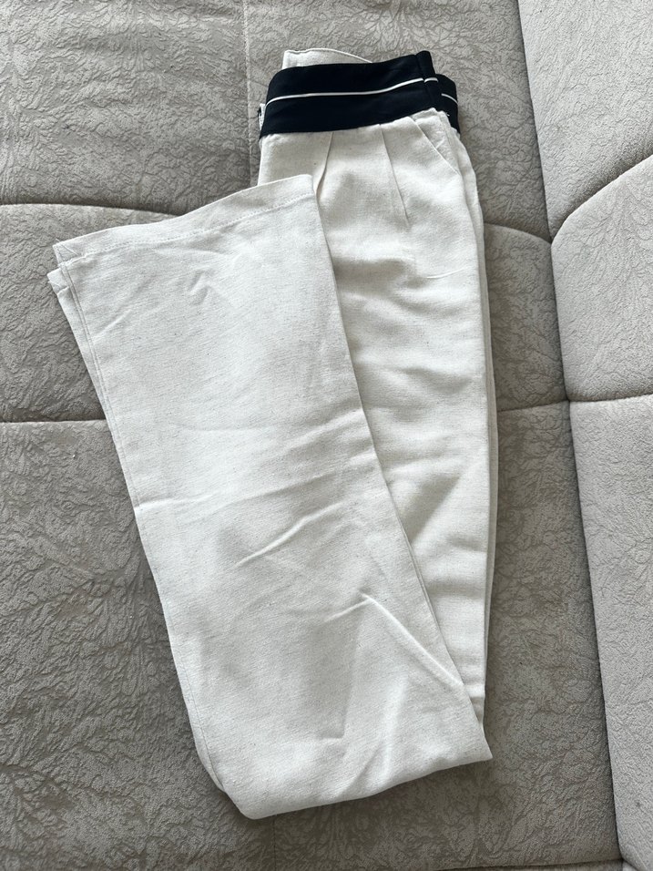 Kadın keten kumaştan,normal boy beli lastik kemer detaylı pantolon. Beyaz renkte, desen içermeyen rahat kesim pantolon.161 boy 48 kiloda kullanıldı