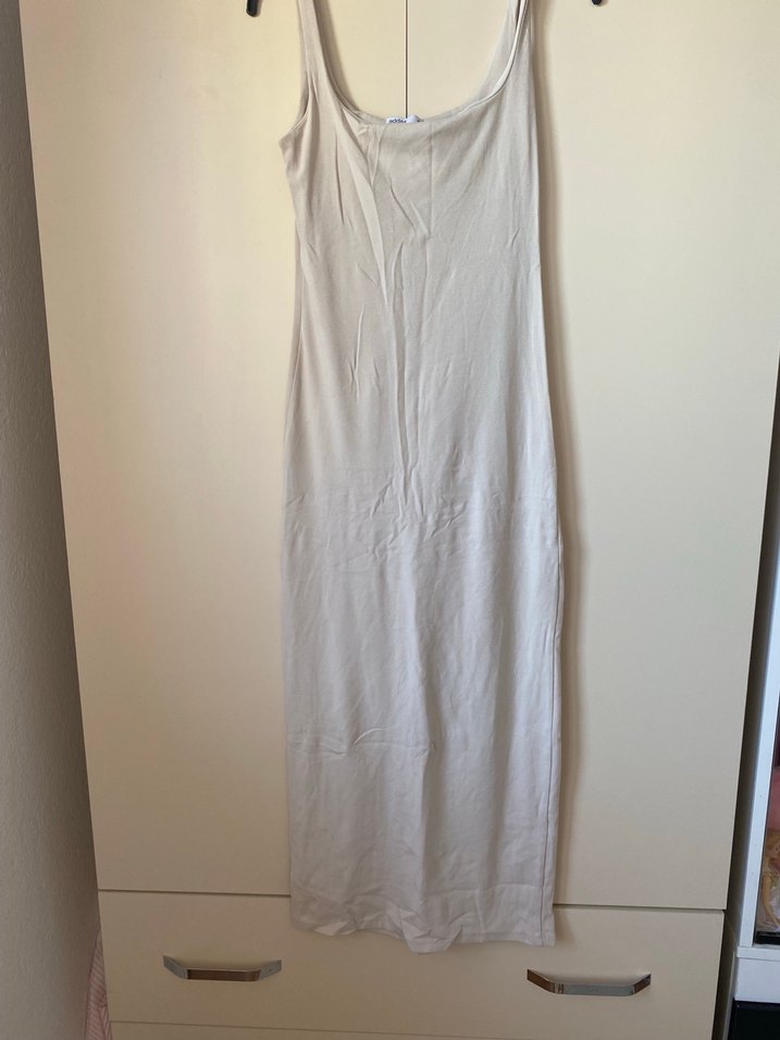 Keten kumaştan, kolsuz ve beyaz renkli, uzun ve vücuda oturan kesimde, tek renk sade bir elbisedir. Günlük kullanıma uygundur.