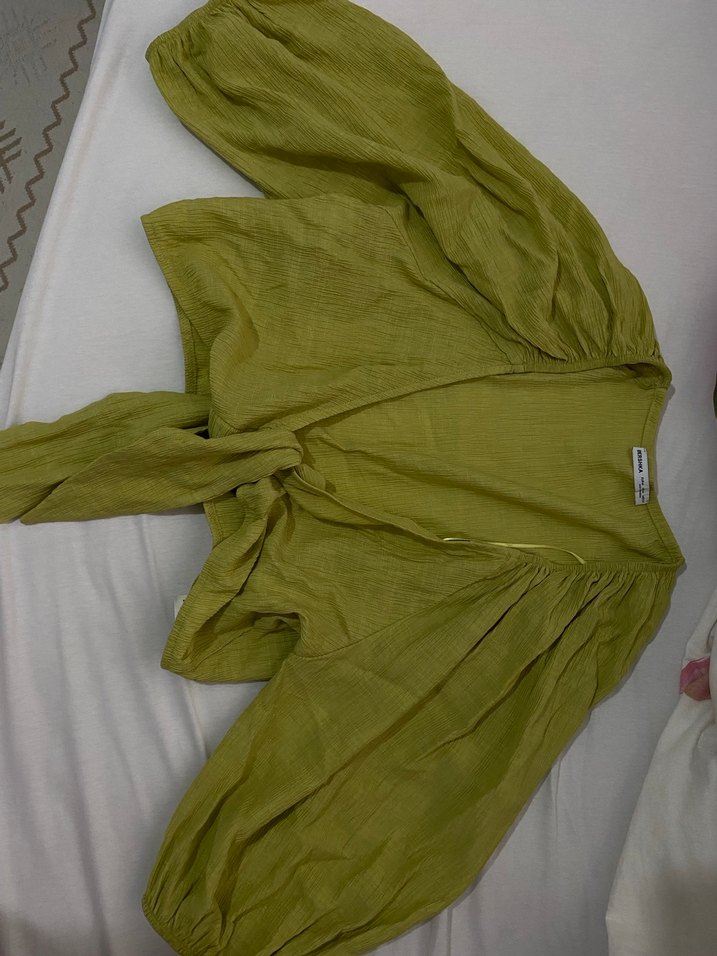 Parlak haki keten kumaştan, uzun kollu, salaş kesim, drapeli ve V yakalı midi boy kadın bluz, bohem tarzı yansıtıyor.