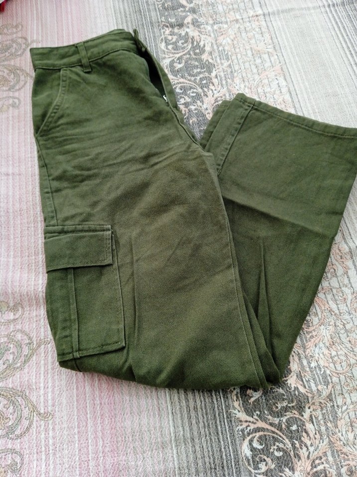 Kadınlar için bol kesim, kemerli, uzun boy haki pamuk pantolon. Yan cepli ve sade tasarımlı, günlük rahat kullanıma uygundur.