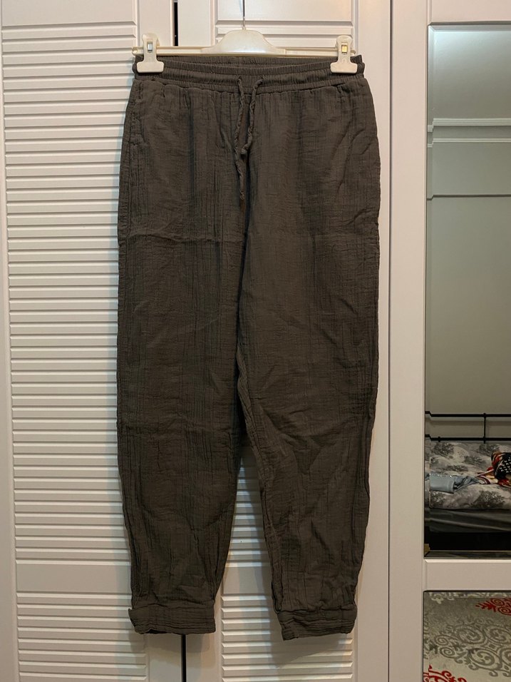 Kadınlar için antrasit gri keten, bol kesim müslin kumaş pantolon. Rahat ve günlük kullanıma uygun, sokak stiline uygun. Az kullanıldı herhangi bir sorunu yoktur. Ürün boyu 90 cm’dir. 36-38 beden uyumludur.