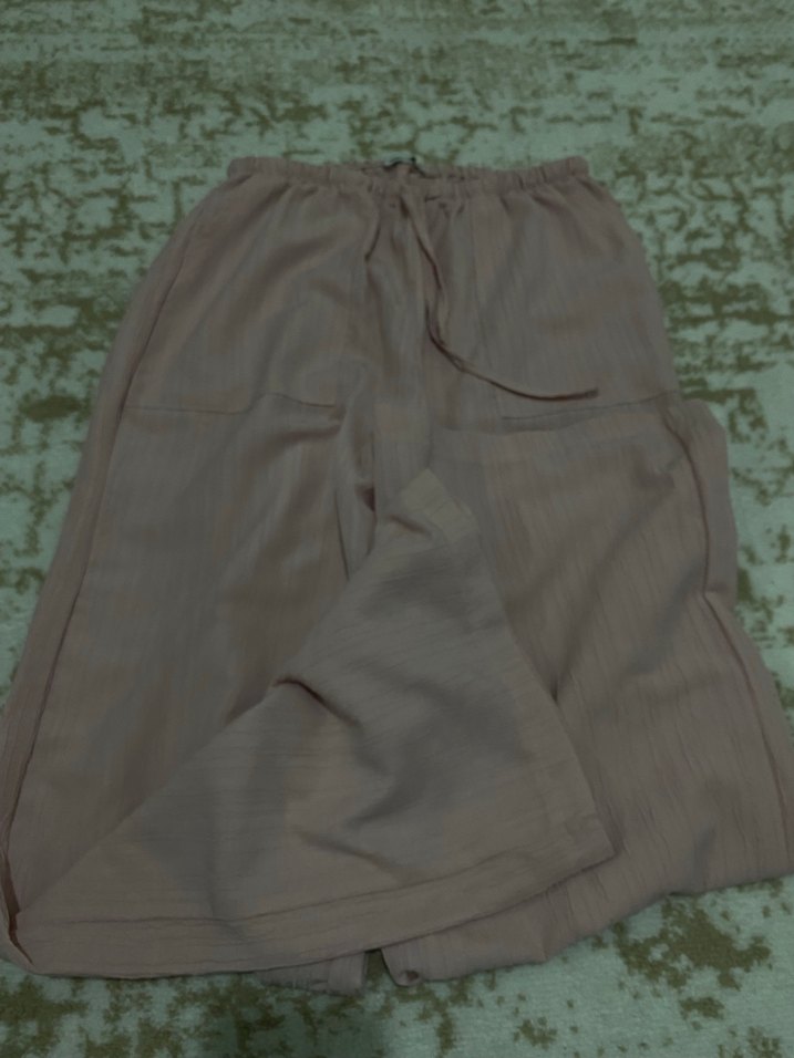 Bol kesim, uzun bej keten pantolon, pile detaylı, rahat ve trend günlük stil için uygundur. 1 kere giyildi defosuz
