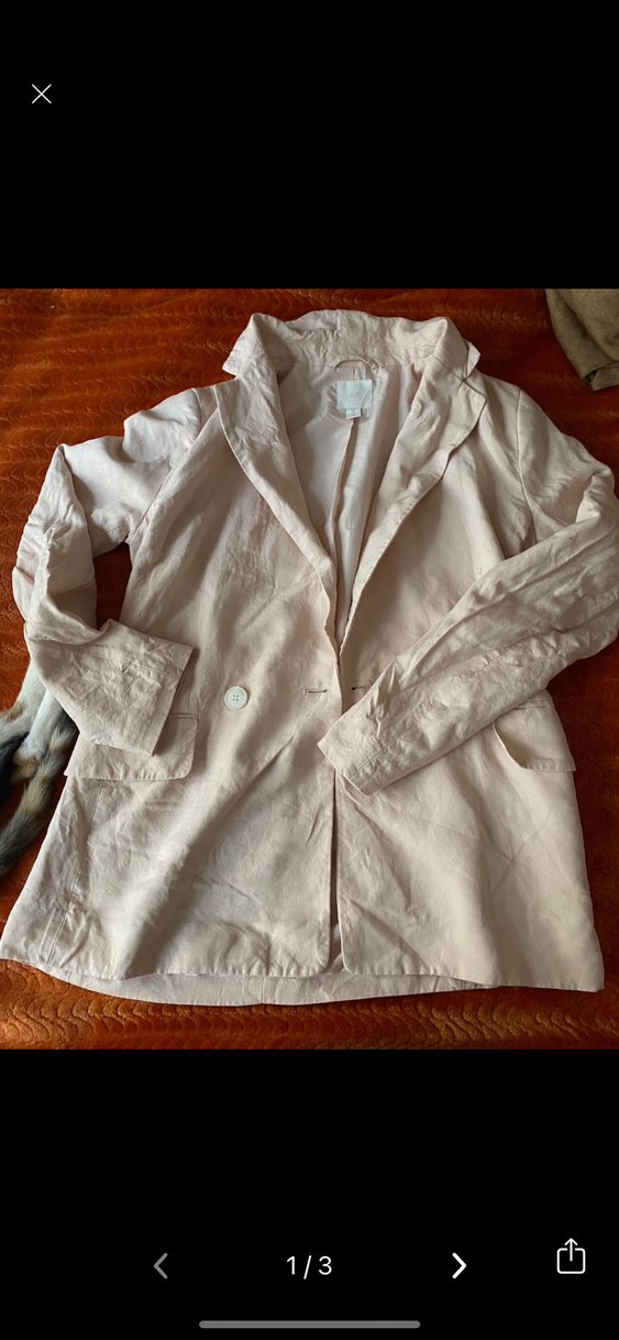 Bej keten kumaştan, düğmeli, normal uzunlukta ve regular fit kesime sahip, notched lapel yakalı uzun kollu kadın blazer. Minimalist ve günlük kullanım için uygundur.