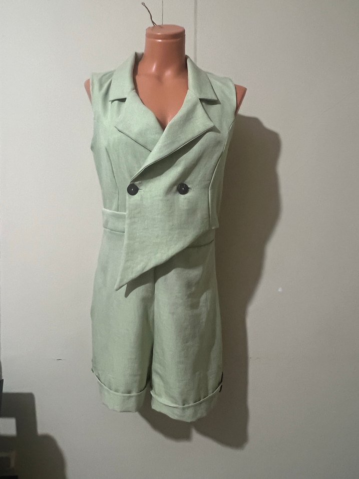 Kruvaze Yaka Şort Tulum Keten kumaştan, düğmeli ve yakalı, pastel yeşil renkte, regular fit kısa tulum. İş ortamına uygun, sokak tarzı şıklığı sunar. Sadece 2 kez giyilmiştir tertemiz sorunsuz defosuz