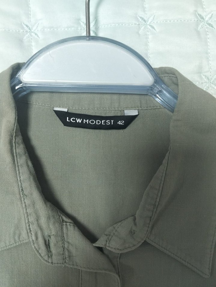 Kadın keten gömlek, düğmeli ve uzun kollu. Notch yaka ve bol kesim, minimalist normcore tarzında haki renkte. LCW Modest, beden 42.