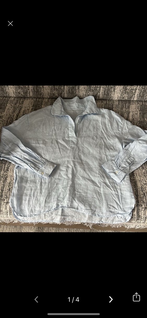 Kadın keten gömlek, uzun kollu ve yakalı, düğmeli ön kısmı ile rahat kesim, mavi tonunda. Günlük kullanıma uygun.