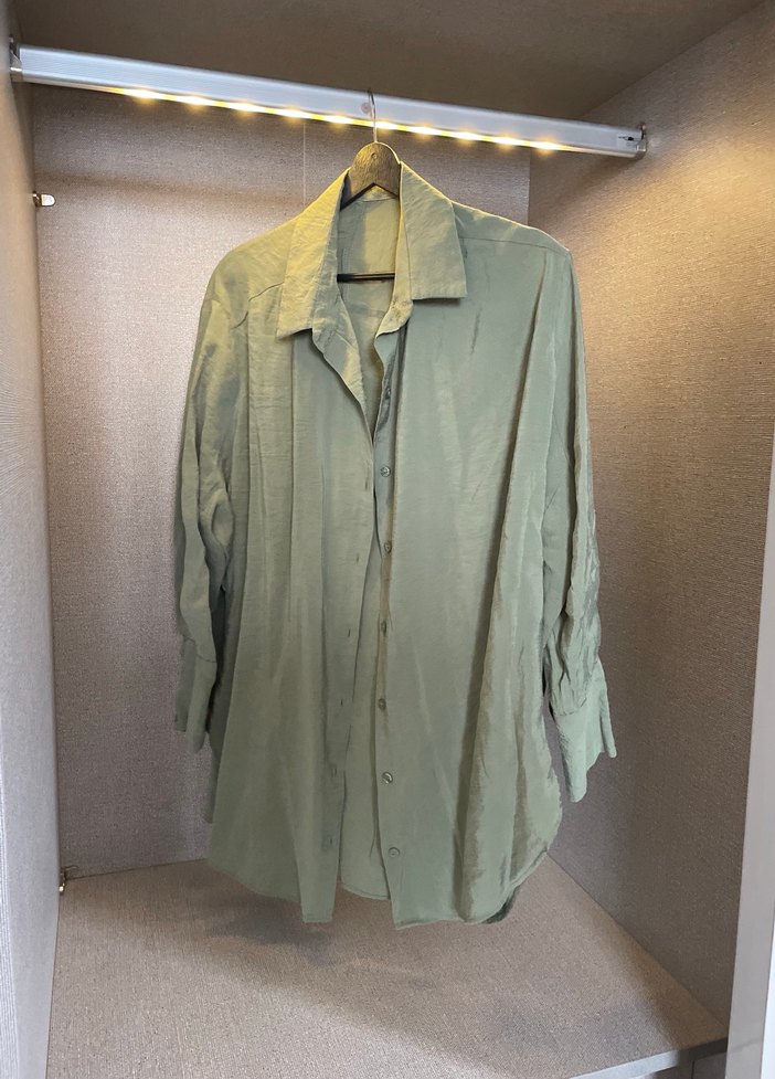 Bol kesim keten haki gömlek, uzun kollu ve yakalıdır. Düğmeli kapama ve midi boyuyla rahat sokak stiline uygundur.