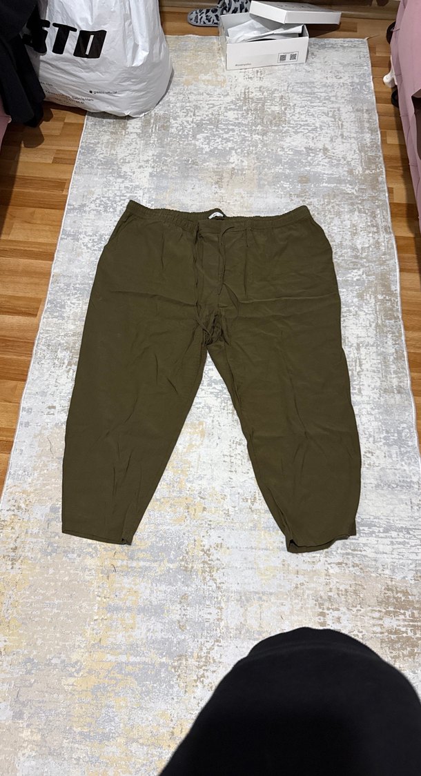 Kadınlar için haki renkli, keten kumaştan yapılmış, midi boy ve bol kesim pantolon. Sokak modası ve spor tarzına uygun, desen içermeyen rahat bir model.