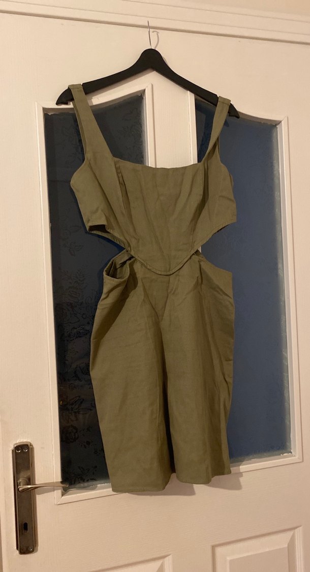Keten kumaştan yapılmış, belden kemerli, askısız ve kolsuz tasarıma sahip haki renk midi uzunluğunda tulum. Minimalist sokak modası için uygun.