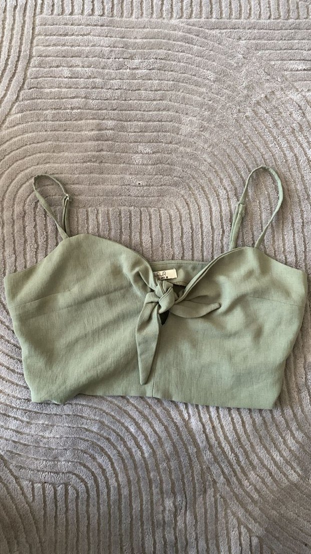 Keten kumaştan yapılmış, askılı halter yaka ve önünde bağlamalı detaylı, rahat kesimli khaki crop top.
