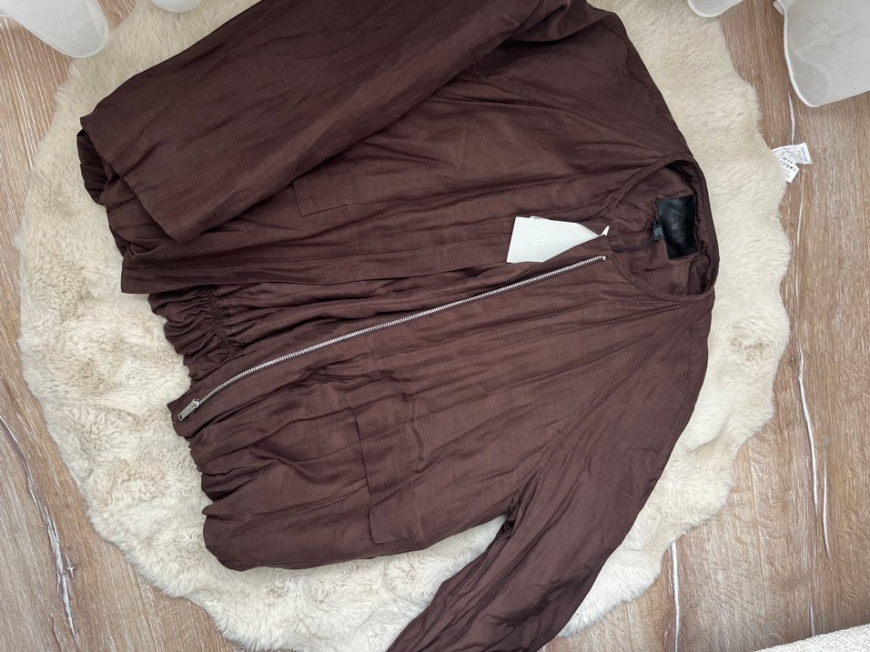 Keten kumaştan, kahverengi fermuarlı kadın ceket. Uzun kollu, normal boyda ve notalı yaka tasarımlı, rahat kesimdir. Minimalist günlük stil için uygundur.