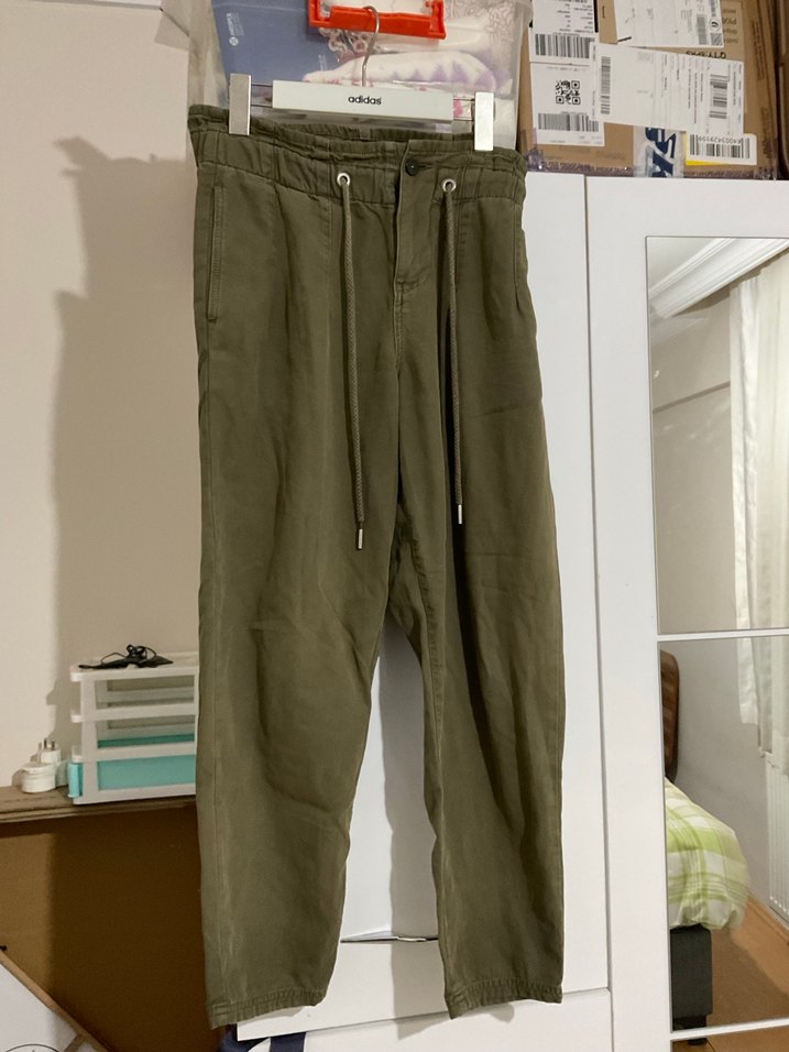 Kemer detaylı, keten kumaştan yapılmış, bol kesim kadın pantolonu. Günlük kullanıma uygun, rahat bir stil sunar. Sadece düğmesi değişti Paça boyu:94 Kalça:76