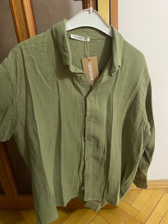 Keten kumaştan, düğmeli ve uzun kollu , yakalı, bol kesim khaki gömlek. Günlük rahat kullanıma uygundur.