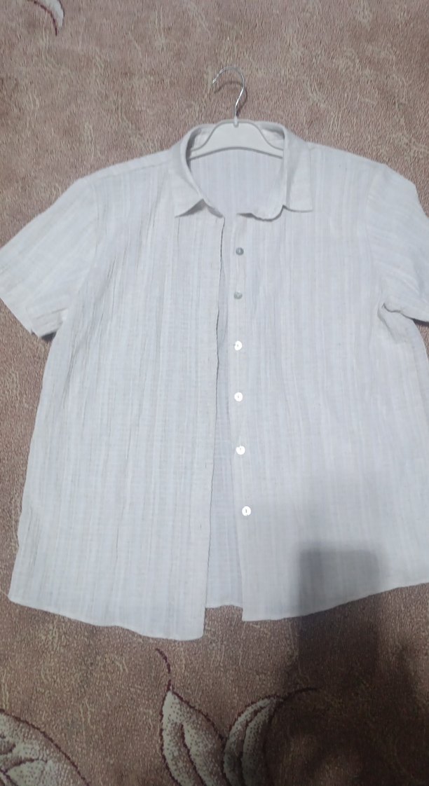Kadın keten kısa kollu gömlek, yakalı ve düğmeli önde. Rahat kesimli, normal midi boyunda, beyaz ve gri tonlarda sade tasarım. Günlük rahat kullanıma uygun.