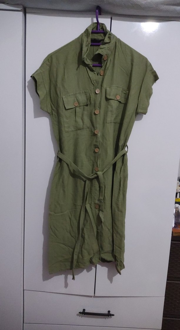 Keten kumaştan, kısa kollu ve kuşaklı, bol kesim midi elbise. V yaka ve düğmeli ön detaylarıyla günlük kullanıma uygun.