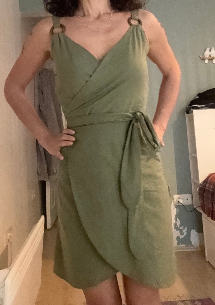 Keten kumaştan, straplez yakalı ve drapeli, salaş kesim midi elbise. İnce askılı, bele bağlamalı bohem tarzı, romantik akşamlar için uygun.