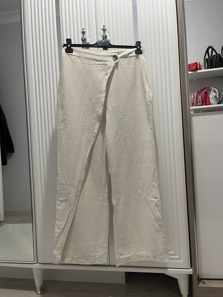 Beyaz keten kumaştan, midi boy ve geniş paça, minimal ve normcore tarzda rahat kesim kadın pantolon. Günlük kullanım için şık ve kolay kombinlenir.