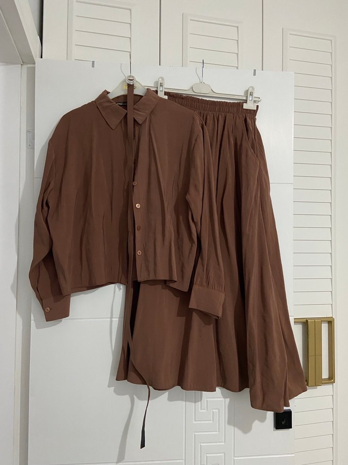 Kadın Keten Midi Kahverengi Salaş Etekli takım