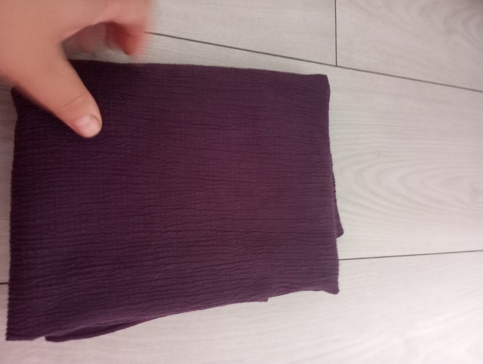 Koyu mor renkte, keten kumaştan pilili kadın eşarp. Minimalist ve bohem tarzda, sade bir görünüm sunar.