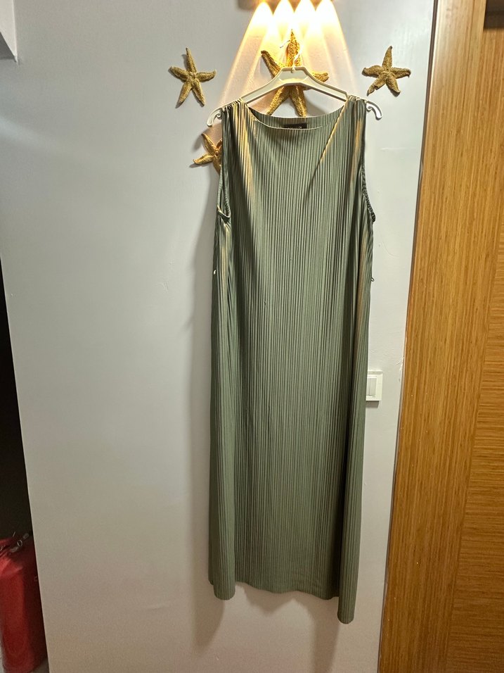 Keten kumaştan, pilili dokulu, askılı ve bol kesim uzun elbise. Minimalist tarzda, günlük kullanım için uygun khaki renk.