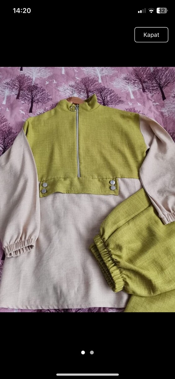 Kadın keten kumaştan üretilmiş, rahat kesim mini eşofman takımı. Uzun kollu, yuvarlak yakalı, düğme detaylı, iki tonlu pastel haki renkli, günlük kullanıma uygun rahat sokak stili.