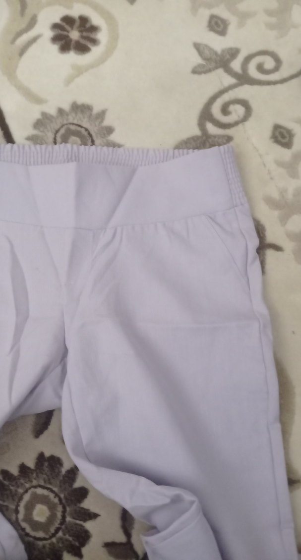 Kadınlar lila renkli yumuşak keten kumaştan yapılmış, rahat kesim mini pantolon. Minimalist ve zahmetsiz şıklık sunar.