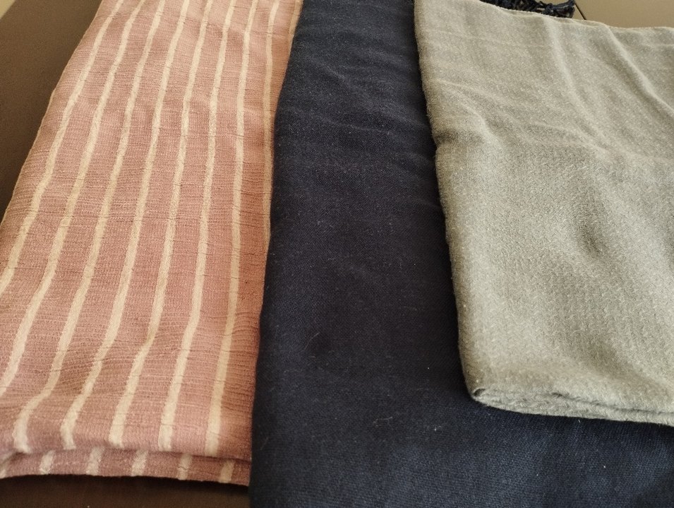 Kadınlar için koyu gri keten kumaştan yapılmış, drapeli tasarıma sahip, rahat ve bohem tarzda sade bir şal.