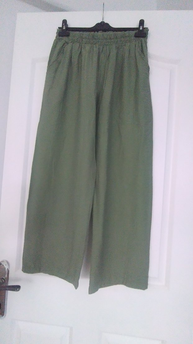 Kadın Keten Salaş Haki Geniş Paça Pantolon