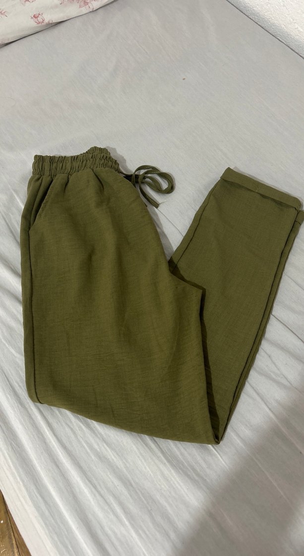 Kadın keten kumaştan, haki renk, kemerli ve normal boy midi uzunluğunda salaş kesim pantolon. Günlük rahat sokak stiline uygundur. ️