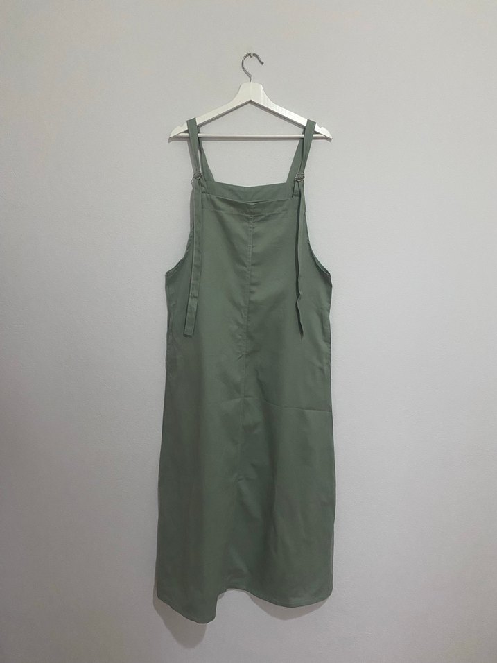 Keten kumaştan, salaş kesim, uzun askılı kadın tulumu. Askısız görünümlü, askılı, minimalist ve desensiz tasarım, günlük kullanım için uygundur.