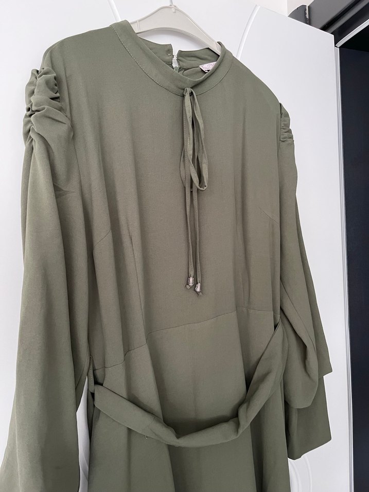 Keten kumaştan, salaş kesim uzun elbise. Yuvarlak yaka, büzgülü askılı kollar ve kemer detayına sahiptir. Günlük kullanıma uygun minimalist tarzda.