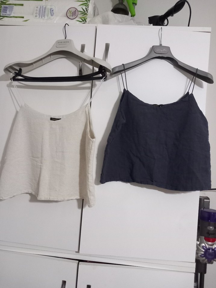 Keten kumaştan, askısız ve kısa kesim, bol kesim kadın atlet. Beyaz ve gri renk seçenekleriyle minimal ve rahat tarz için uygun.