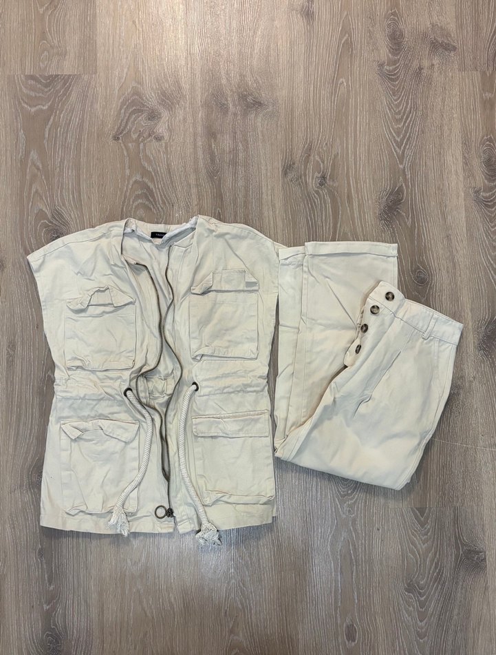 kadınlar için keten, kolsuz, bol kesim ve kısa boy ceket ve pantalon takım Çok cepli ve kemerli tasarımıyla rahat ve şık. Günlük sokak stili için uygun.