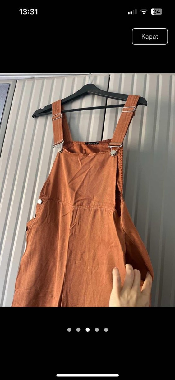 Askılı, tokalı kahverengi keten midi tulum, bol kesim ve yüksek yakalı, günlük rahat sokak stili için uygundur. ✨