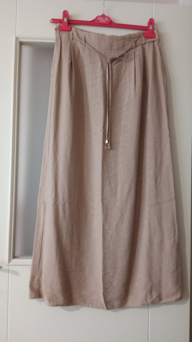 Lcw markasına ait, yumuşak keten kumaştan yapılmış, bej renk uzun etek, drapeli ve bol kesimiyle rahat bohem tarz sunar. Minimalist ve desensiz, günlük kullanım için uygundur. Kullanılmıştır ama bir sorunu yoktur, temizdir.