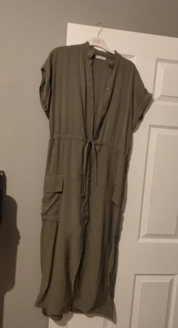 Kadın keten kumaştan, bol kesim, kısa kollu uzun elbise. V yakalı ve kemerli, sokak stili ve günlük kullanım için uygundur.