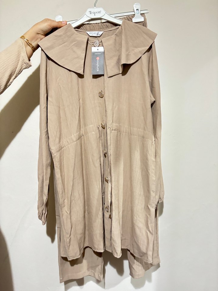 Vizon renkli, keten kumaştan uzun ve bol kesim kadın takım . Uzun kollu, yakalı ve düğmeli tasarıma sahip, günlük kullanım için uygundur.