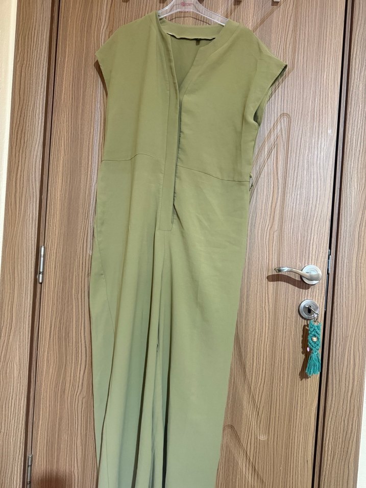 Nefes alabilen keten kumaştan, v yaka ve drapeli tasarıma sahip, pastel haki renkli, kolsuz, regular fit tulum. Minimalist tarz, günlük kullanıma uygun.