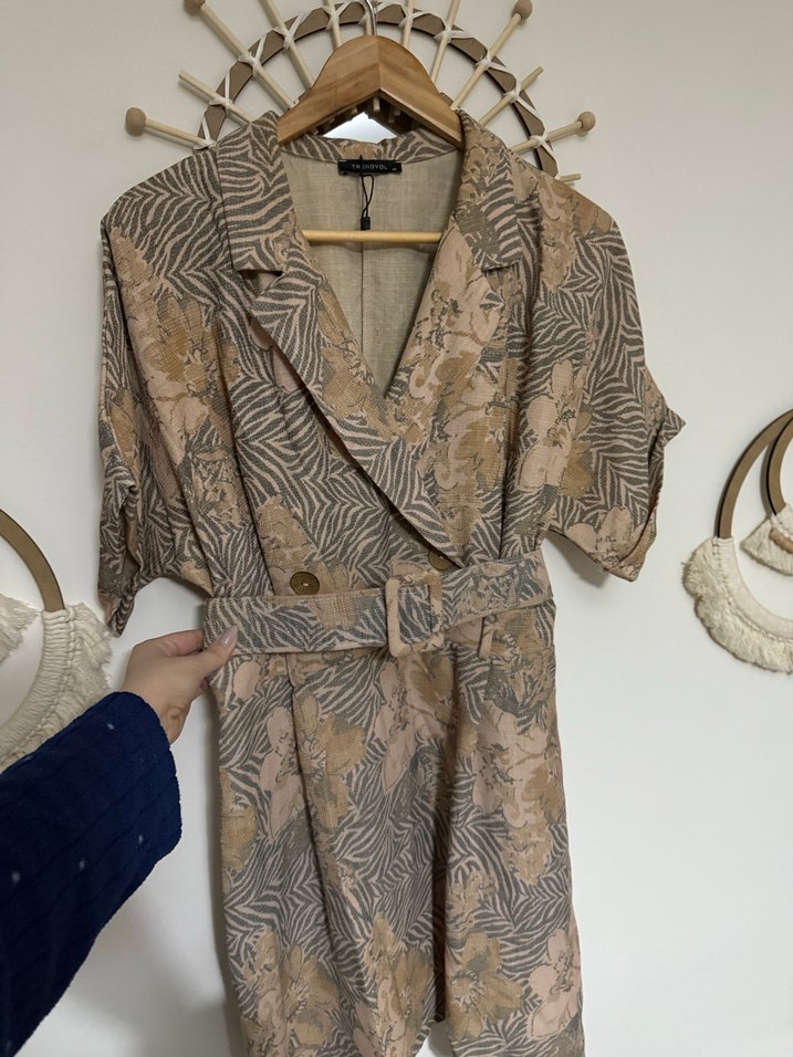 Kadın keten mini tulum, gri-bej zebra desenli, kısa kollu, yakalı ve düğmeli. Salaş kesimi ve kemeriyle bohem tarzı yansıtıyor.