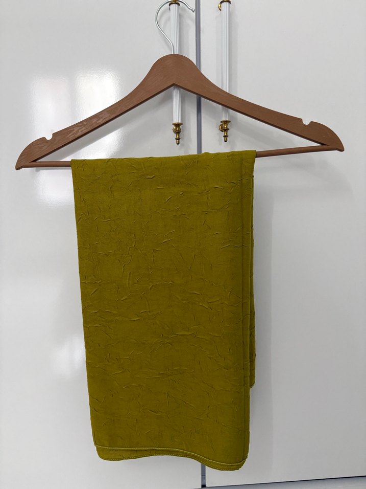 Kadın keten kumaştan, parlak khaki renkte, bohem ve minimalist tarzda drapeli şal. Bohem, hippie ve retro görünüm için uygundur.