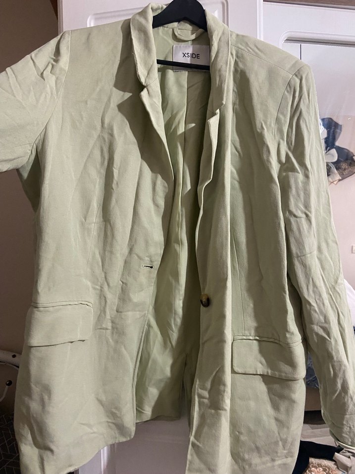 Khaki renkli kadın blazer, keten kumaştan yapılmış, normal boyda, tek düğmeli ve kesik yakalıdır. Uzun kollu ve desen içermeyen bu ceket günlük kullanıma uygundur. Çok az giydim bi kolunda küçük leke var ( kolum arka kısmında kalıyor)görsele ekledim 4. Görseldeki yakın çekimdeki rengi asıl rengidir