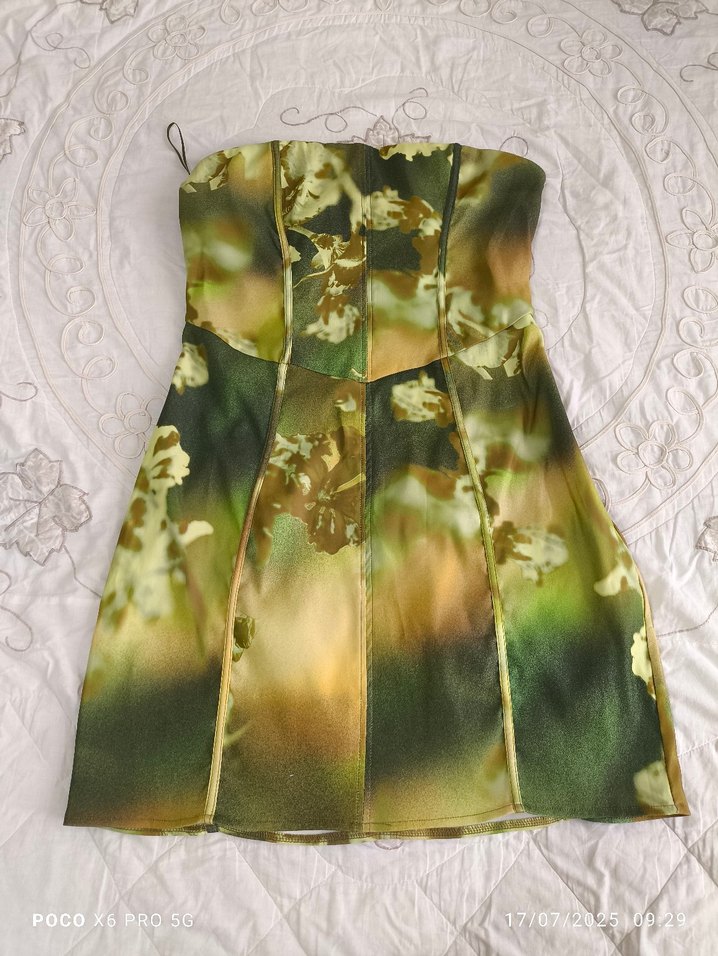 Kadınlar için straplez ve kolsuz, sentetik kumaştan yapılmış, parlak khaki tie-dye desenli, drapeli, vücuda oturan midi mini elbise. görselde belirttiğim gibi çok ufak bir delinme mevcut onun dışında sorunsuz
