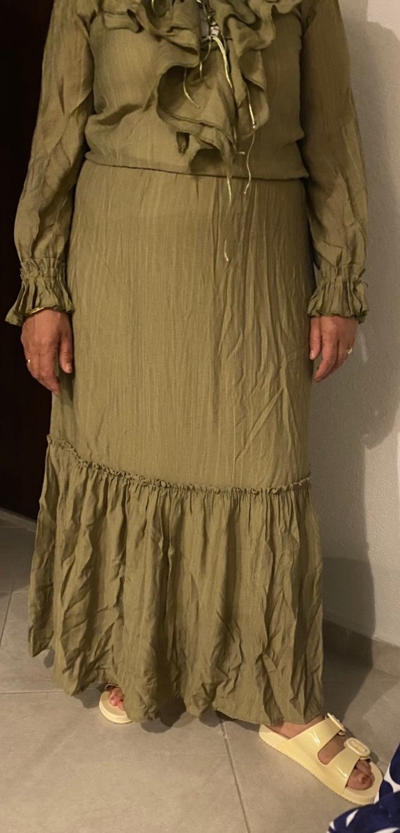 Parlak haki renkte fırfır detaylı uzun elbise. Bohem ve retro tarzını yansıtır. Ürünü 1 kere giydim aldığım gibi satıyorum. 1500tl ye aldım 1000tl ye satıyorum fiyatta yardımcı olacağım
