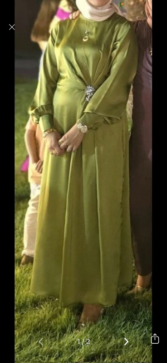 Khaki renkli, uzun kollu ve V yaka detaylı bu uzun abiye elbise, drapeli tasarımı ve bol kesimiyle vintage tarzda şık bir görünüm sunar.